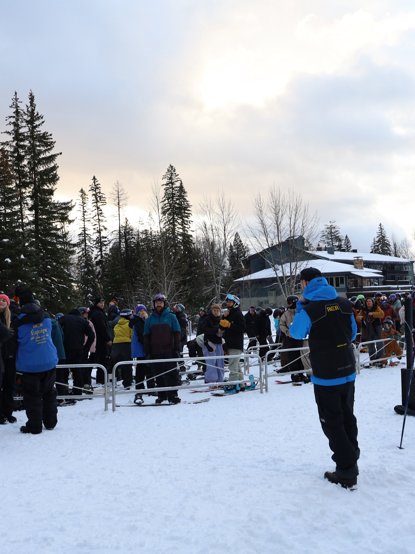 Opening day line up on the Griz Chair just outside the Cornerstone Lodge – Photo: Fernie Alpine Resort